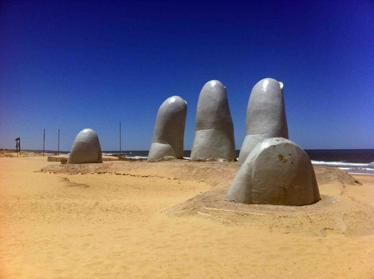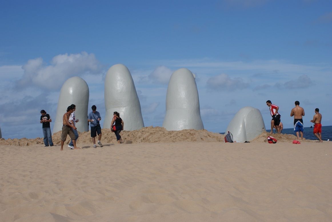 (Da Wikipedia) La Mano (The Hand) is a sculpture in Punta del Este by Chilean artist Mario Irarrázabal. It depicts five human fingers partially emerging from sand and is located on Parada 1 at Brava Beach in Punta del Este, a popular resort town in Uruguay. It is also known as either Los Dedos (The Fingers), or Hombre emergiendo a la vida (Man Emerging into Life). In English, its popular name is The Hand.
